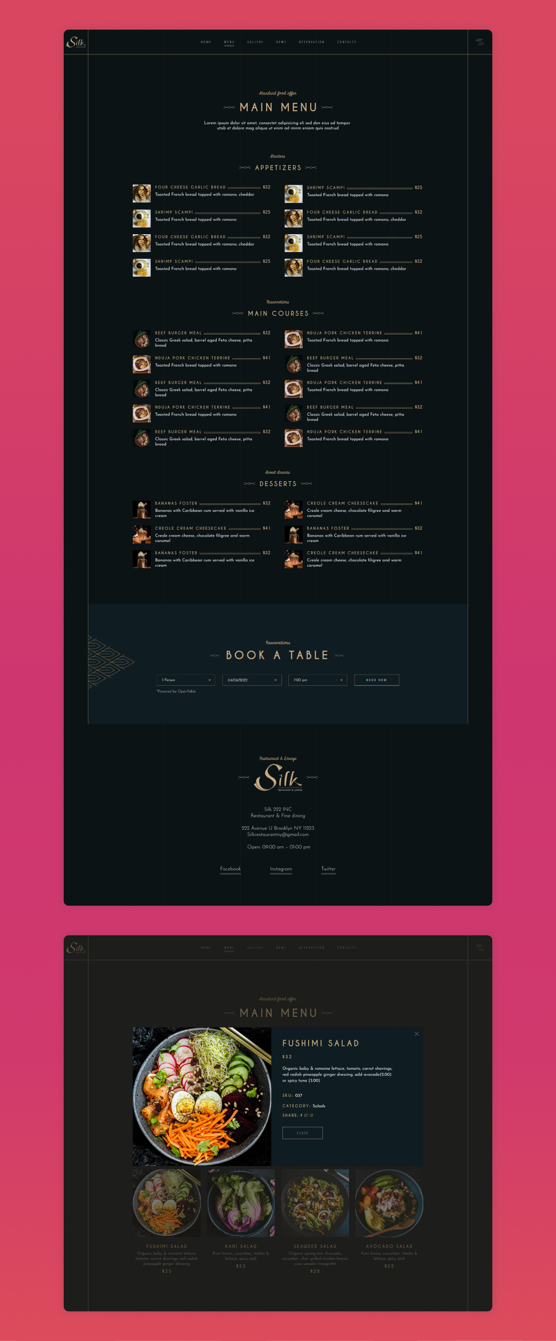 Темный фон + золотой цвет — неизменный дуэт люксового дизайна. Шёлк, золото и роскошь — это вещи, которыми мы вдохновлялись при разработке дизайна сайта для ресторана в Нью Йорке.
